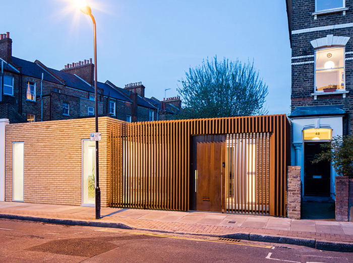 A new family home for a constrained back garden site in a Hackney Conservation Area. The house has a refined materials palette of ochre brickwork, anodised aluminium windows, corten steel fence and gate.