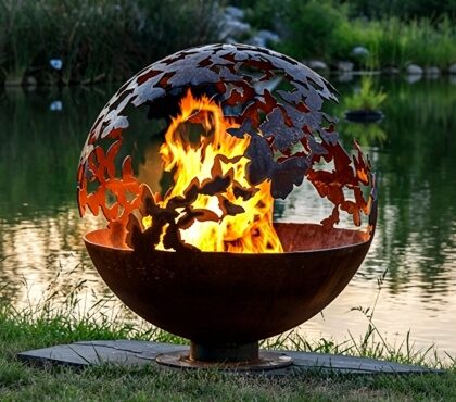 Corten Steel Sphere Fire Pit with Butterfly Theme
