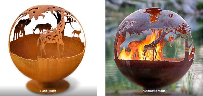 Handmade—the designs are hand-drawn on the ball and cut entirely by hand using a plasma cutter