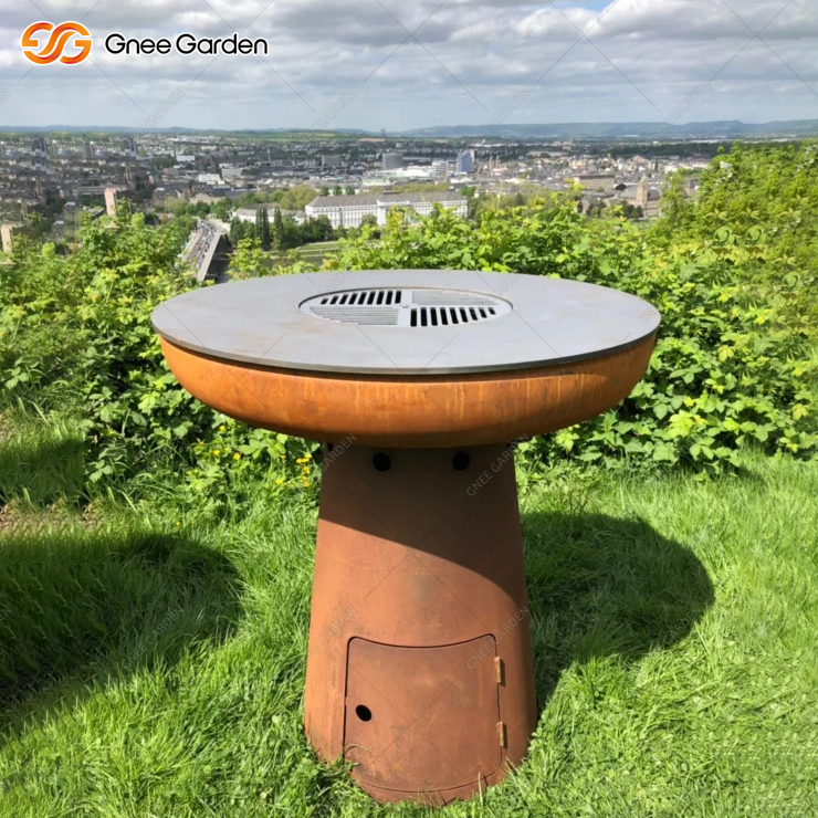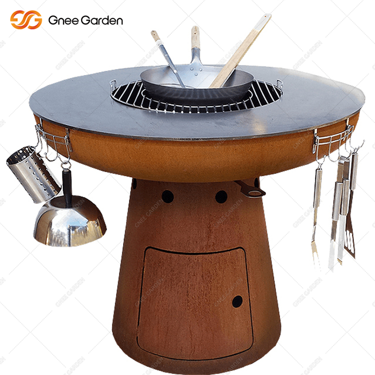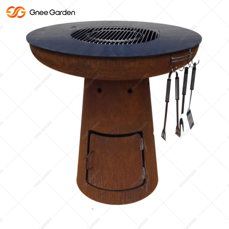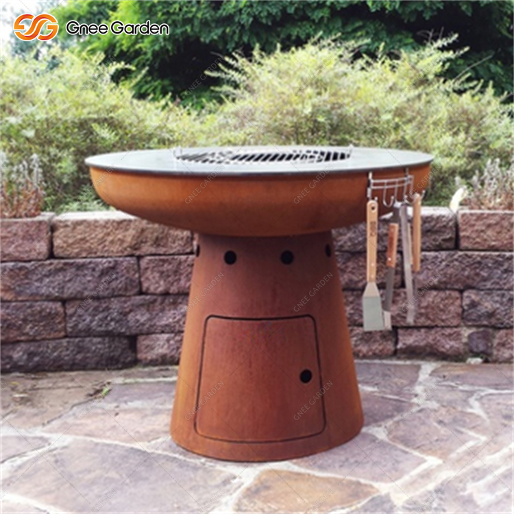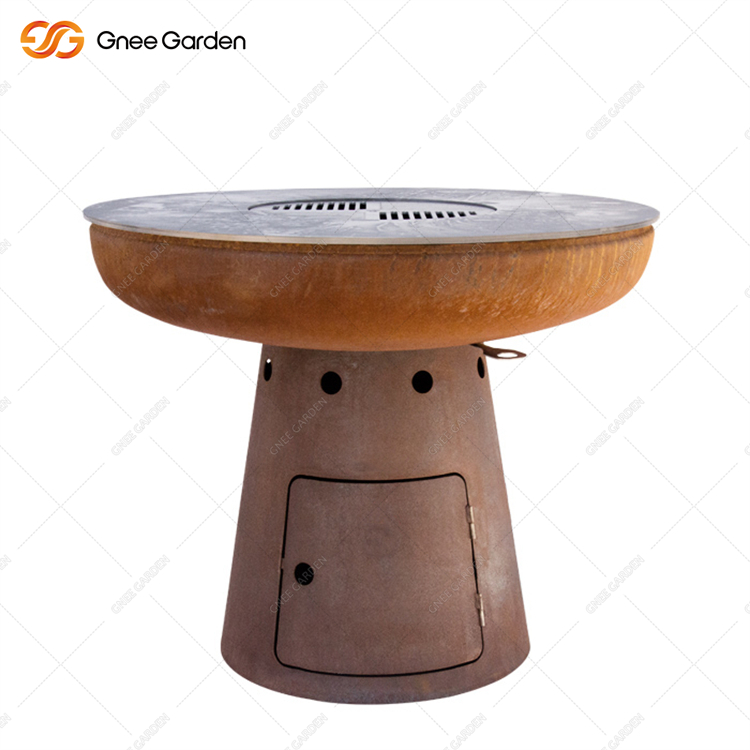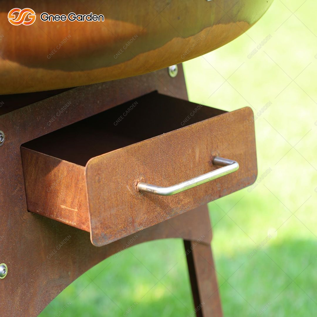 It's got a classic look and nice curves. Our Corten Wood Burning Fire Barbecue Grill GN-BBQ-211 is a charcoal grill fireplace with an infinitely variable air supply. The standard ash bin is hidden behind the built-in door. It's got a timeless design and shapely curves.