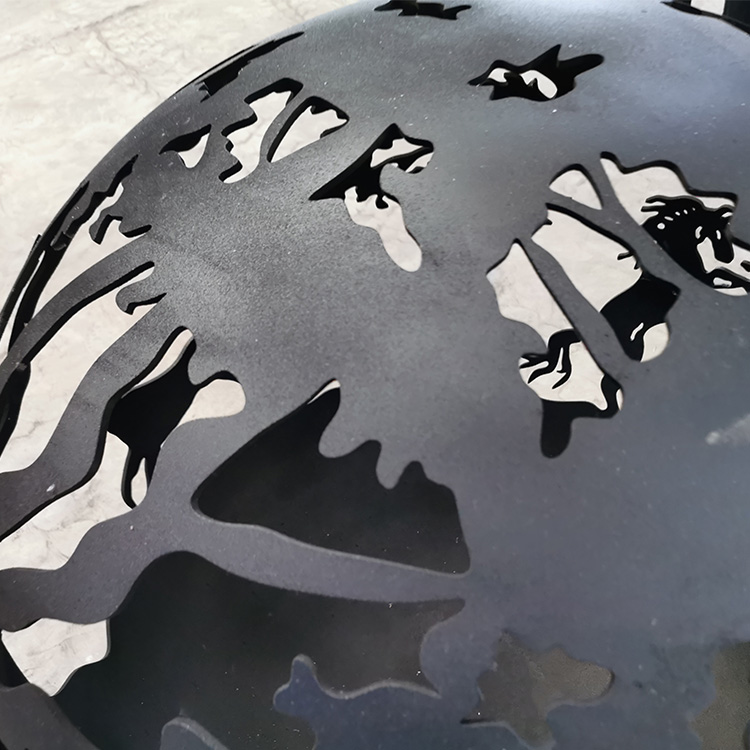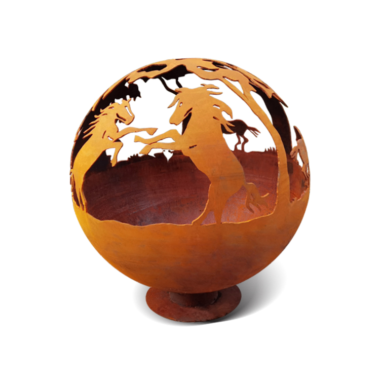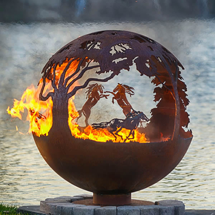The sculptural globe fire pit features three horse scenes. First are two rearing stallions facing each other, then two separate galloping horses.