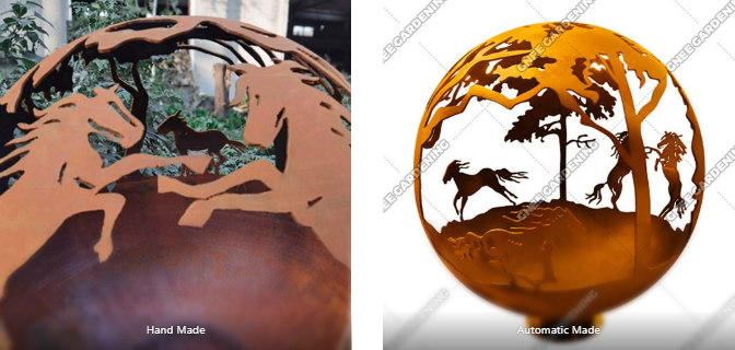 Handmade—the designs are hand-drawn on the ball and cut entirely by hand using a plasma cutter