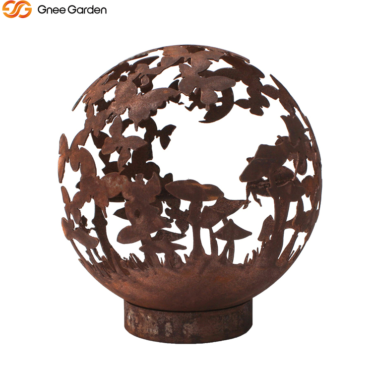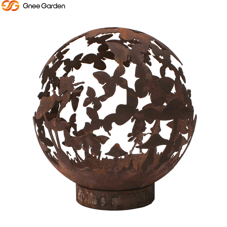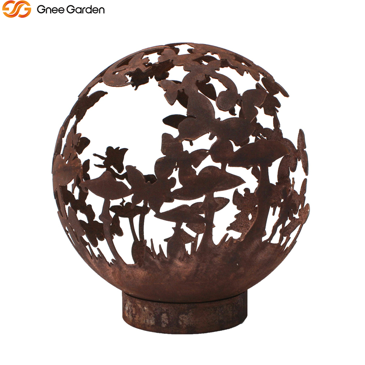 The Butterfly Design Sphere Fire Pit is available in four sizes: 600mm, 800mm, 900mm, and 1000mm in diameter. Butterflies encircle this wood-burning firepit.