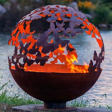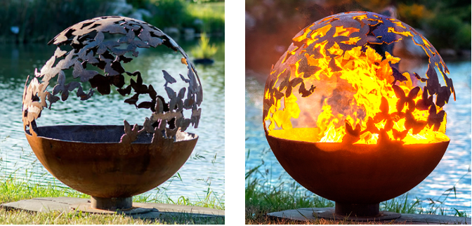 The butterfly sphere fire pit is unique functional work of art. Each fire pit is hand drawn and hand cut out of Corten steel, and every piece of functional art is completely unique.