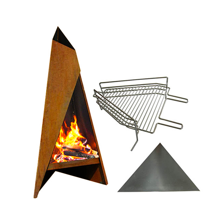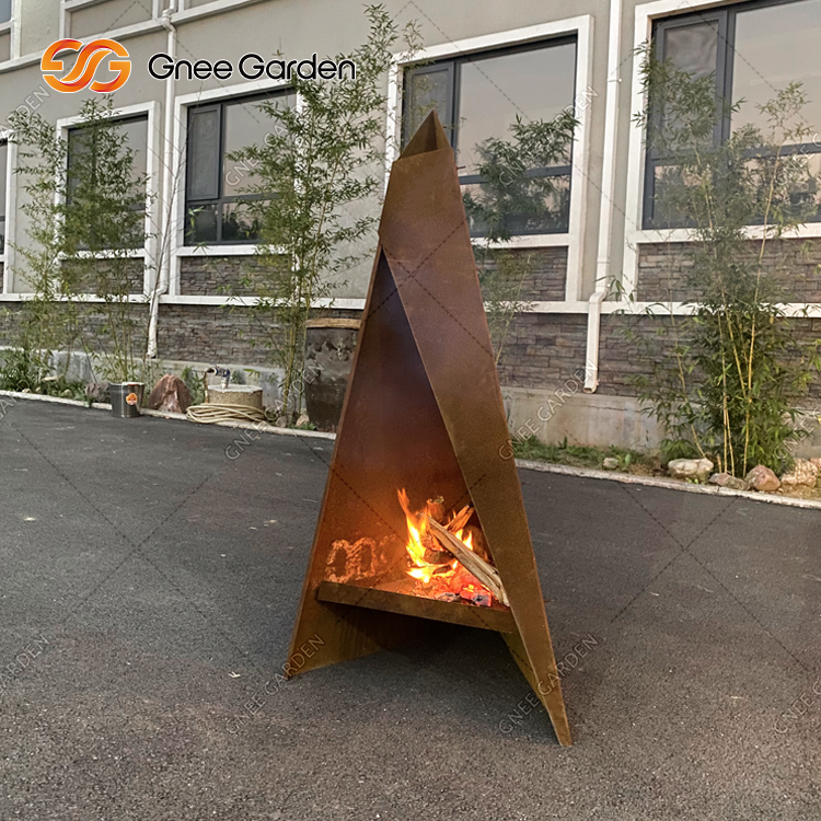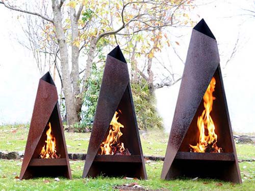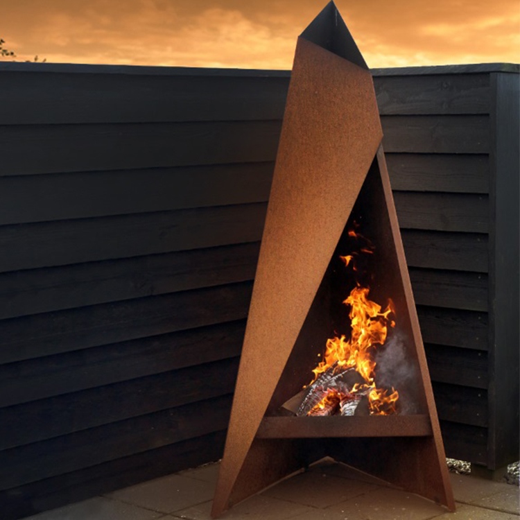 Sculptural Chiminea Design: Modern triangular silhouette with a sculptural effect, doubling as a statement piece in any outdoor setting.