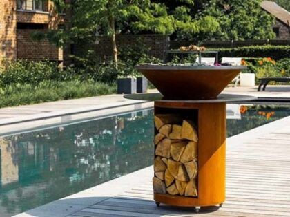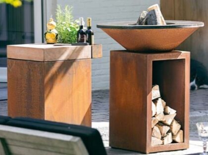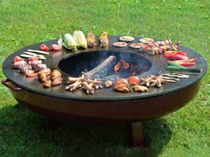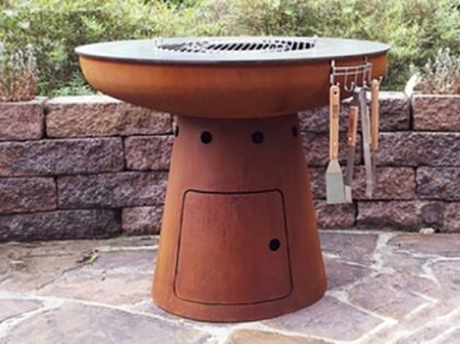 This is both a modern outdoor fire pit and a barbecue grill. It is perfect for your backyard.