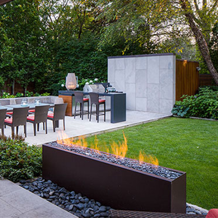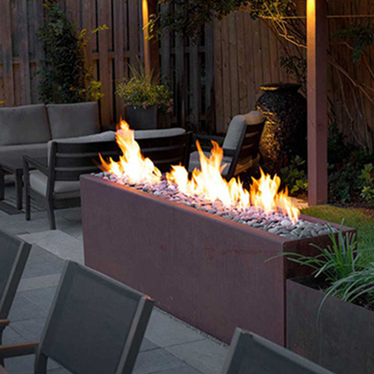 The GN-FP-306-H outdoor corten steel gas fire pit has been designed to emphasize the material qualities of heavy-gauge steel.