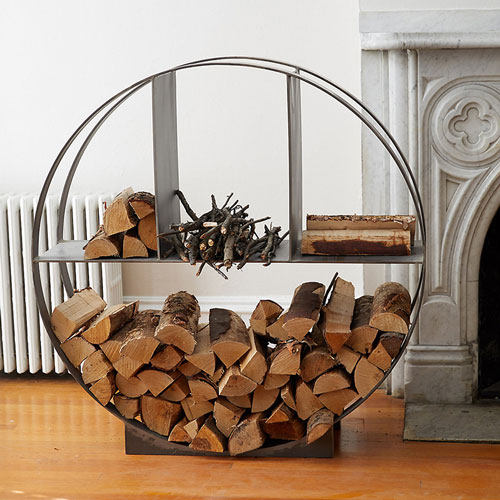 A practical statement piece for the hearth or porch, this contemporary steel log hoop is hand-forged from durable steel with compartments for holding logs of different shapes and sizes.