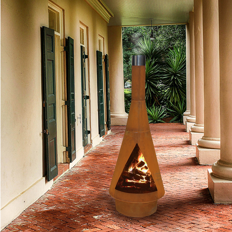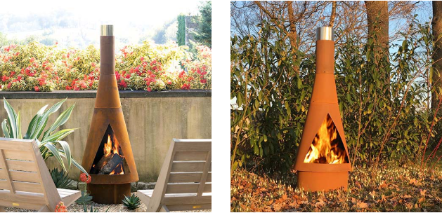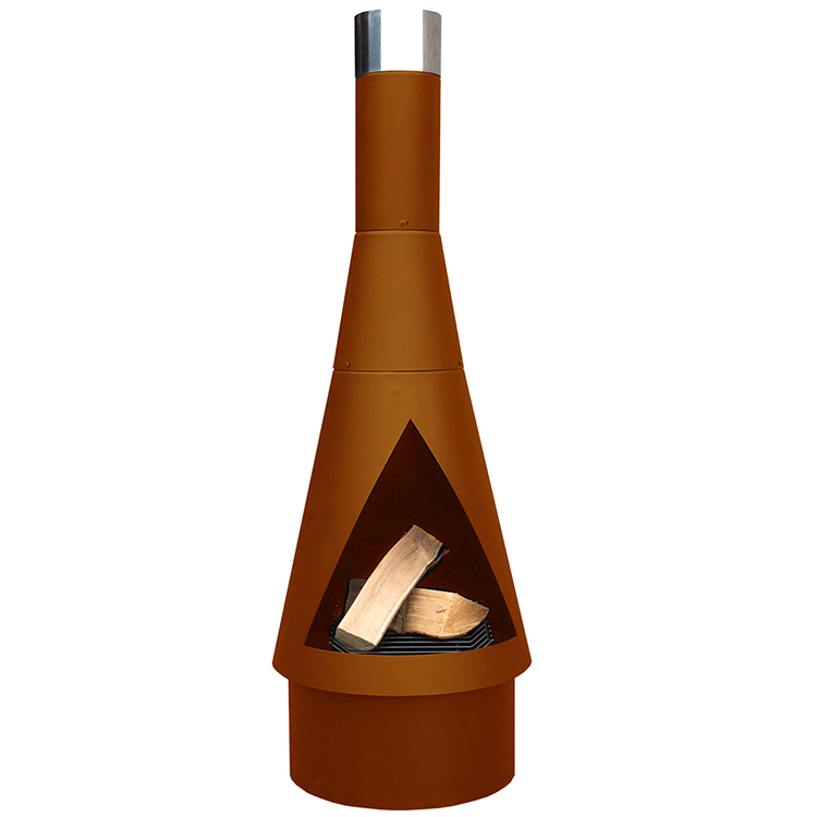 Modern Angled Chiminea Design: Sleek, tapered silhouette with a contemporary look, creating a striking focal point.