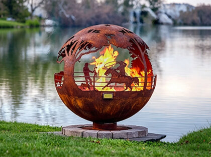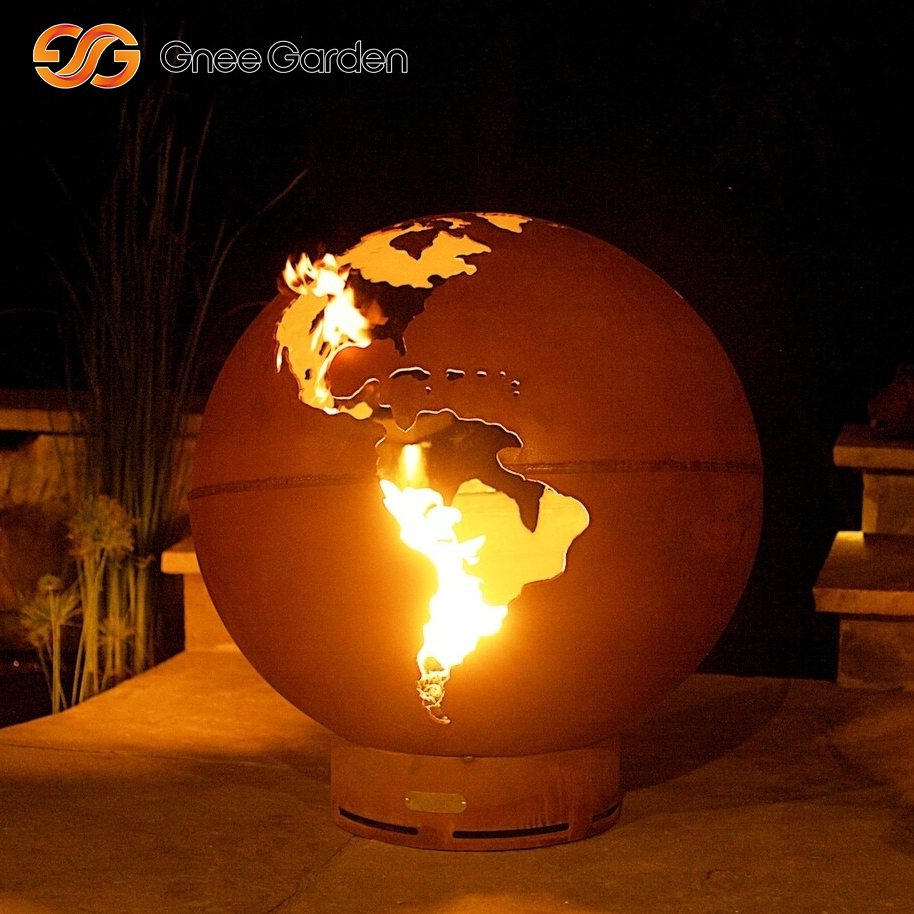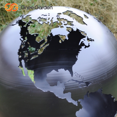 Our home, plain and simple! This world globe fire pit is relieved of the earth features and promotes the watery two-thirds of our planet in steel. When afire, this design highlights the earth's fiery inner core.
